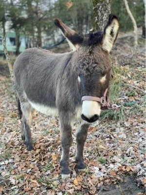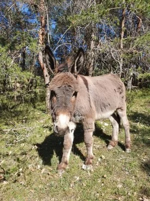 J’était sauvé de l’abattoir en 2016 avec mes 2 fréres Portos et Aramis. J’avais vers 2 ans. Sans papiers, sans puce. Je suis le deuxième frère, ce qui n’est pas toujours facile. Je suis calme, curieux et timide, car j’ai eu un passé difficile. Je sais que l’homme n’est pas forcement gentil. Pourtant, j’aime protéger les anesses, surtout les jeunes. Je suis le nounou.